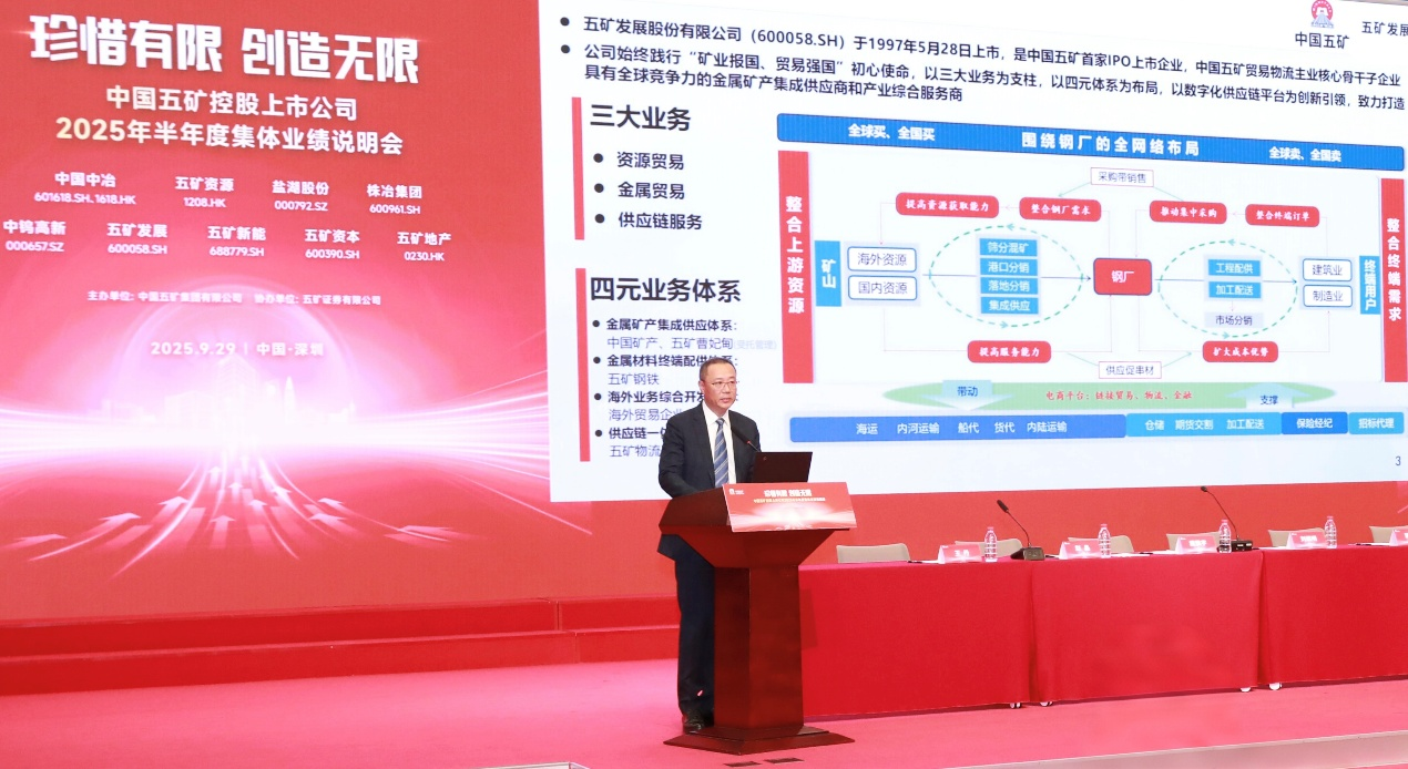 魏涛表示,2025年是“十四五”规划收官之年和“十五五”规划谋篇布局之年。公司以成为“具有全球竞争力的金属矿产集成供应商和产业综合服务商”为使命愿景,着力加强金属矿产集成供应体系、金属材料终端配供体系、供应链一体化服务体系、海外业务综合开发体系建设,依托中国五矿全产业链综合优势和公司全要素服务能力,大力推进数字化、智能化转型,坚定不移打造供应链安全可控的维护者、产业链服务价值的创造者、大宗商品产业生态的组织者、现代流通服务体系的引领者,取得了积极进展。后续公司将全面落实“稳增长、强产业、促改革、抓创新、防风险、保安全、强党建”工作方针,持续聚焦主责主业,夯实行业优势地位,努力提升经营业绩;坚持“以投资者为本”理念,强化市值管理和投资者回报,尽快恢复上市公司分红能力,与投资者共创价值共享、合作共赢的美好未来。