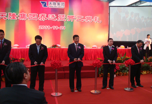 21日上午,周总裁一行参加了天隆集团新厂房竣工暨投产仪式。周总裁与中国航天科工集团总会计师刘跃珍共同为天隆集团办公楼前的一对石狮揭幕。冯副总裁在新厂房竣工暨投产庆典仪式上致辞。他回顾了天隆的发展历程,代表集团公司对新厂房的竣工投产表示祝贺,并对苏州市委、市政府二十多年来对天隆的指导和支持表示感谢。随后,集团公司总裁助理、五矿发展总经理姚子平代表五矿方股东与其他股东方代表一起为祥狮点睛、为天隆祈福。周总裁与苏州市副市长周伟强、航天科工集团总会计师刘跃珍以及苏州新区管委会主任王跃山一起为天隆集团新厂房投产推动启动杆,并与其他嘉宾一起为天隆新厂房启用剪彩。