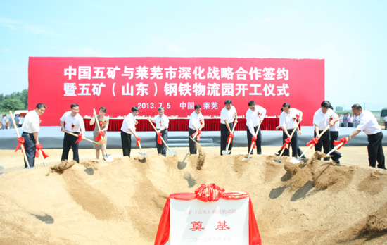 7月5日,周中枢总裁、赵润田副省长、刘士合书记出席集团公司与莱芜市深化战略合作签约暨五矿(山东)钢铁物流园开工仪式并发表讲话,姚子平副总裁与王磊市长分别代表双方签约,鲁中矿业总经理谢继祥介绍了山东物流园有关情况。仪式由王磊市长主持。随后,周总裁与赵副省长等领导一起挥舞铁锹、铲起沙土,为五矿(山东)钢铁物流园奠基。