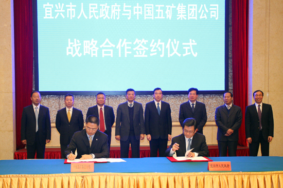 在致辞中,周总裁对出席仪式的领导和嘉宾长期以来给予中国五矿关心和支持表示感谢,并介绍了集团公司的战略愿景与近年来的经营业绩:中国五矿作为中国最大的金属矿产品综合经营企业,正在加快战略转型,调整产业结构,致力于成为世界一流的金属矿产集团。今年1—10月,面对复杂严峻的市场环境,中国五矿实现营业收入3030亿元,同比增长18.97%,保持了良好的发展势头。周总裁讲到,宜兴市是中国乡镇工业发祥地之一,经过30多年的发展,今天的宜兴经济实力强劲,产业基础雄厚,形成了自身独特的优势和吸引力。中国五矿与宜兴市人民政府签署战略合作协议,将为双方进一步扩大合作领域、提升合作层次奠定良好基础,对中国五矿拓展华东市场、提升行业综合竞争优势和可持续发展能力具有重要意义,对加快宜兴房地产及物流服务等产业的发展、优化产业结构将产生重要推动作用。周总裁希望双方本着互利共赢的原则,促成相关项目早日落地启动,为宜兴市经济社会发展注入新的活力,为国家经济发展做出新的贡献。