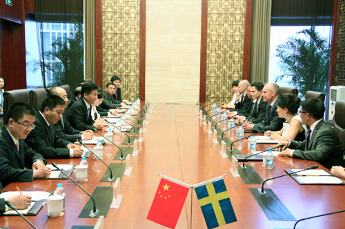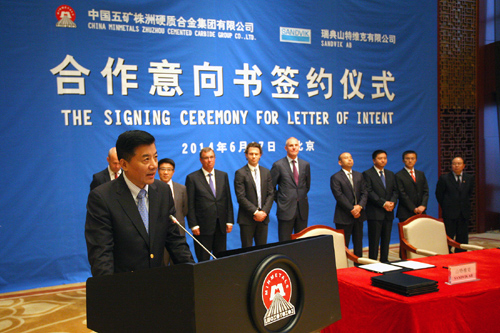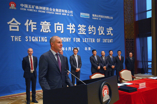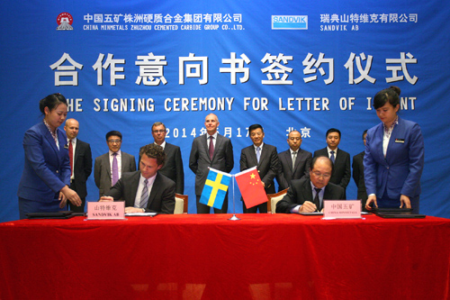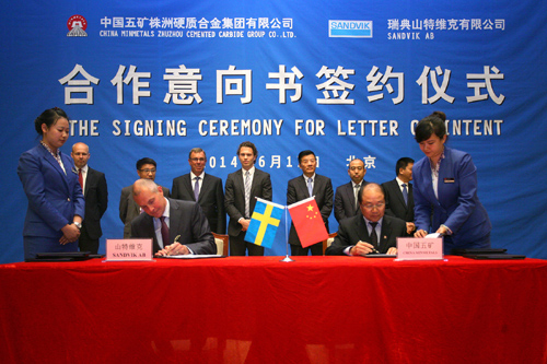 五矿有色控股副总经理、钨事业本部总监杨伯华与山特维克公司总裁范圣德、山特维克公司机械加工总裁古斯塔夫松代表双方签署了项目合作意向书。