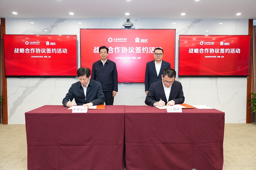 3月19日,中国五矿与上海期货交易所(以下简称上期所)在沪续签战略合作框架协议。中国五矿党组书记、董事长陈得信与上期所党委书记、理事长田向阳座谈并见证签约。上期所党委副书记、总经理鲁东升,上期所副总经理张铭,中国五矿党组成员、总会计师段文务出席。